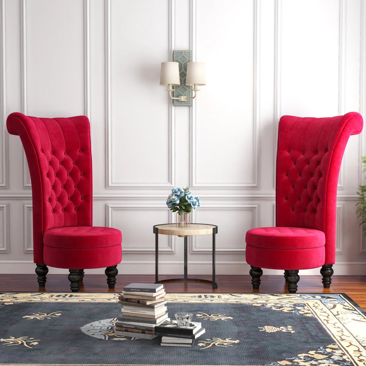 Bring style and character to your living space with this royal high-back velveteen tufted chair from Rosdorf Park. Elaborating on the classic Chesterfield design, this plush high-back velveteen chair creates an accent piece that is both off-kilter and elegant. Soft velveteen encases and thick padded cushions give you hours of comfortable, stylish sitting, while colorful velveteen upholstery gives this chair a stunning, unique appearance that is sure to stand out in all the right ways. Create a unique space with this versatile chair that can become gothic, renaissance, or upper Manhattan with the right additional decor choices. Have fun with your space with our quirky, fashionable accent chair.